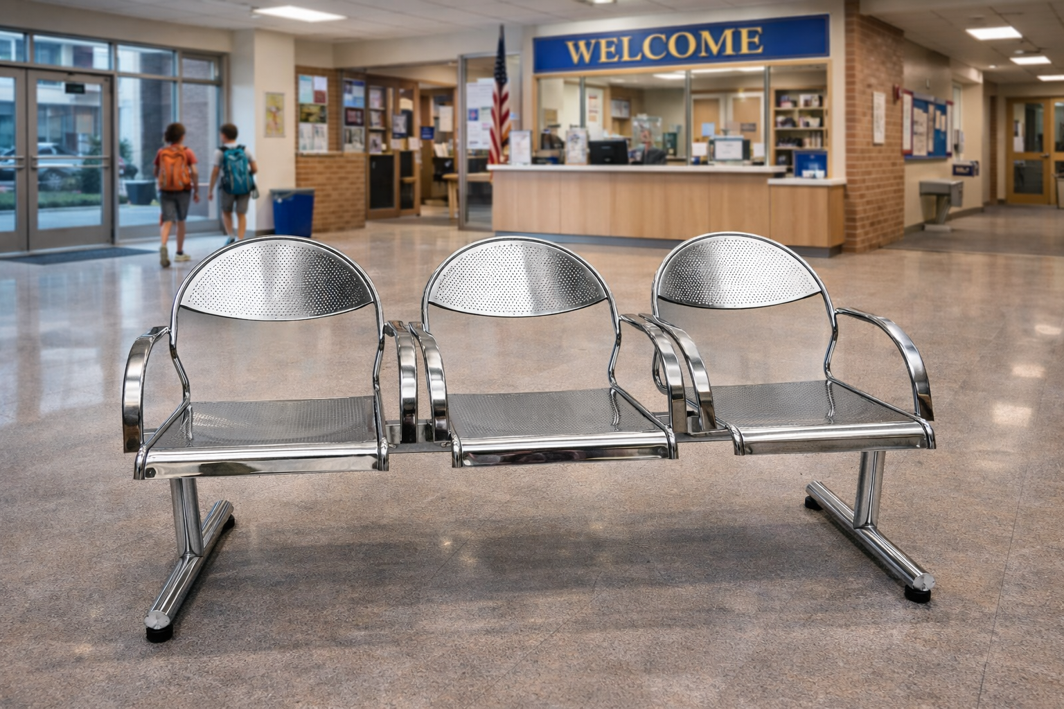 Heavy-duty stainless steel seating designed for high-traffic public spaces.